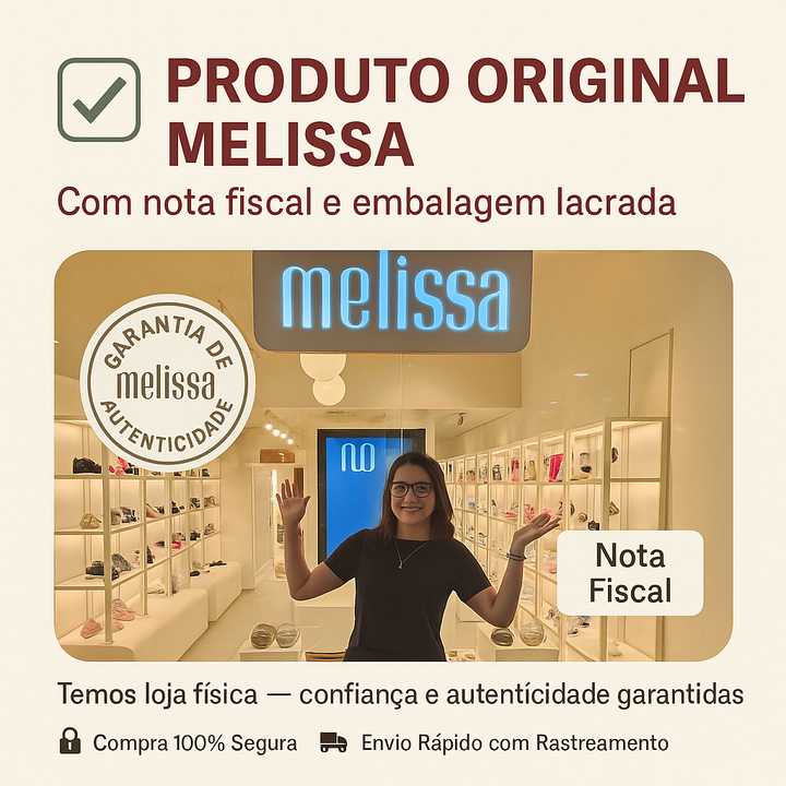 | Destaques | Autêntica, confortável, estilosa, original Melissa |